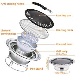 O que você obterá Corpo da grelha, tigela de carvão, placa de queima de carvão, assadeira, rede para assar, suporte de panela e cabo anti escaldante. Todas as ferramentas necessárias para churrasco estão aqui.