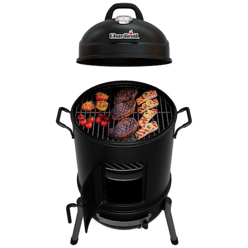 Churrasqueira a carvão portátil e compacta, com sistema de controle de fluxo de ar para regulação de temperatura, corpo revestido de porcelana para durabilidade, cinzeiro removível para limpeza fácil, duas alças de elevação da câmara, medidor de temperatura na tampa, porta de acesso ao fogo moldada e pernas de tubo de aço.