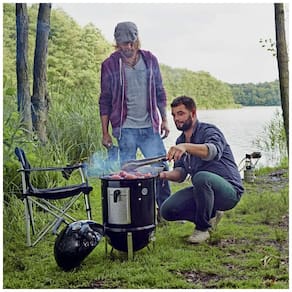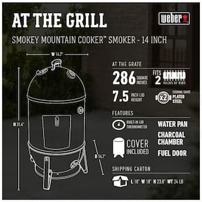 A sua compra inclui Um Fogão Smokey Mountain Weber de , Fumador de Carvão Capa Dimensões gerais do item 37 L x 37 D x 79 H centímetros. Peso do item 10 kg. Dimensões da grade de cozimento cada metade. Área principal para grelhar quadrados. Área total para grelhar quadrados. Fácil montagem necessária, instruções disponíveis no anexo do Guia do Usuário. O fogão Weber Smokey Mountain atinge aproximadamente 190 F de temperatura interna As instruções de montagem 3D interativas para este produto estão disponíveis através do aplicativo BILT Marca: Não Informado