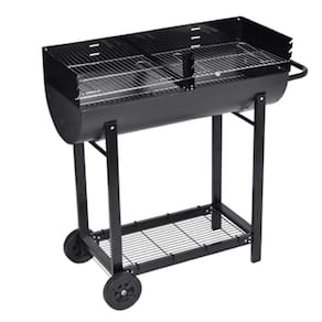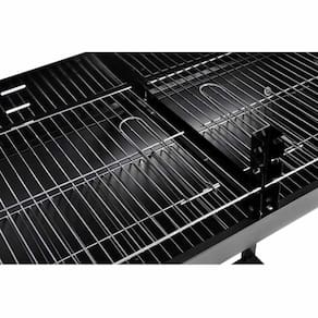 Estão incluídas duas churrasqueiras a carvão e há uma prateleira inferior que é útil para guardar seus acessórios de churrasco. Este churrasco a carvão tem duas rodas, que permitem que você mova o churrasco.