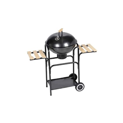 Este churrasco característico a carvão funciona em madeira e carvão. Para controlar a ventilação, há uma alça de madeira na capa (assim você não vai queimar suas mãos). Nas laterais há 2 mesas de trabalho, também feitas de madeira e uma prateleira inferior que é prática para guardar seus acessórios de churrasco. Esta churrasqueira a carvão tem duas rodas, permitindo que você mova o churrasco.