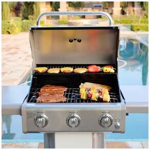 TOTAL DE 30.000 BTUs DE PODER DE COZEDURA Cada um dos três queimadores de grelha nesta churrasqueira a gás propano líquido Kenmore tem uma classificação de 10.000 BTUs. Poder de cozimento mais do que suficiente para qualquer churrasqueira de quintal, deck ou pátio.