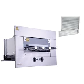 Churrasqueira a Gás de Embutir 4 Espetos Titan GLP 127V + Kit de Venezianas de Ar A Churrasqueira a Gás Titan para embutir em nicho de alvenaria, complementa o seu espaço gourmet e deixa o ambiente mais moderno e prático. É ideal para assar carnes, legumes e pizza e garante um churrasco perfeito. Possui sistema rotativo, iluminação interna, queimadores infravermelhos e regulagem e controle de temperatura. A churrasqueira silenciosa e não produz fumaça. Acompanha kit de venezianas de Ar Informação Técnicas - Função: Assar carnes, peixes, legumes e pizzas - Capacidade total de carnes: 6,8 kg - Cada espeto suporta 1,7 kg de carne - Numero de espetos: 4 - Giro do espeto: 6RPM - Tensão do Motorredutor Elétrico: 12v - Potência do Motorredutor elétrico: 28W - Número de queimadores: 2 um - Controlador de queimador individual - Tensão: 127v - Frequência: 60Hz - Lâmpada: Halopin G9, 127v, 40W - Consumo elétrico 0,06 Kw/h - Válvula de segurança contra vazamento de gás - Gás: GLP - Consumo gás por queimador: 190 g/h - Consumo gás total: 380 g/h - Pressão de funcionamento do Gás: GLP 2,8 a 3,5 KPa - Acendedor automático de fogo Composição - Gabinete externo frontal modular em aço inox AISI 304 escovado - Bandeja coletora de gordura com frente em inox - Grade interna de apoio - Porta frontal de vidro temperado com sistema telescópico - 04 Espetos rotativos com cabo térmico - Sendo 03 simples e 01 triplo Medidas - Medidas produto A x L x P : 48,7 x 70,3 x 56,5 cm - Medidas da embalagem A x L x P : 58 x 64 x 73 cm - Peso Líquido: 18 kg - Peso Bruto: 20 kg Característica e Medidas da Veneziana - Função: Fluxo de ar no nicho padrão Titan 4 espetos - Fixação: com molas ou parafuso e bucha - Palhetas Fixas - Material: Em Alumínio - Cor padrão: Alumínio Anodizado - Dimensão Veneziana Superior: 56 cm largura x 12 cm altura - Dimensão Veneziana Inferior: 56 cm largura x 50 cm altura - Medidas embalagem A x L x P : 20 x 65 x 63 cm; - Peso liquido 2,8kg; - Peso bruto 3,4kg