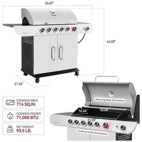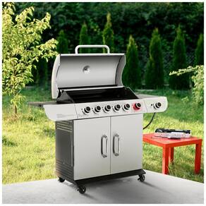 Alto rendimento Esta churrasqueira a gás durável de 6 queimadores gera 71.000 BTU no total, incluindo 5 queimadores tubulares controlados individualmente 10.000 BTU cada, um queimador de sear 12.000 BTU e um queimador lateral 9.000 BTU para obter alto desempenho. Queimador Sear Side Burner O queimador em forma de U no lado direito gera 12.000 BTU para fornecer forte desempenho para grelhar rápido o queimador lateral com tampa de 9.000 BTU é ideal para preparar acompanhamentos ou sopas. Grande retenção de calor a tampa de camada dupla garante excelente retenção de calor para manter os alimentos saborosos e quentes uniformemente. A cúpula cria um ambiente como forno para obter um sabor melhor. O termômetro embutido monitora a temperatura em tempo real. Limpeza sem complicações Feita de aço galvanizado, a bandeja de gordura removível é grande o suficiente para capturar quaisquer pingos que escapem Marca: Não Informado