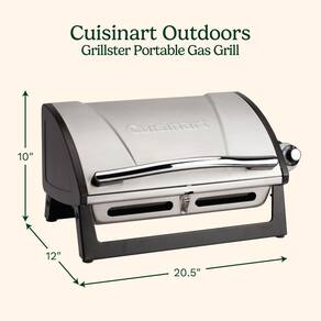 Cuisinart Churrasqueira a gás portátil Grillster, aço inoxidável, compacta, com tampa de bloqueio para facilitar o transporte, churrasqueira a propano pequena de 8000 BTU com grelha de cozinha segura - Superfície de cozimento espaçosa: a grelha de aço esmaltado de 146 polegadas quadradas oferece muito espaço para grelhar e pode ser lavada na lava-louças para facilitar a limpeza. - Desempenho potente: o queimador de 8.000 BTU aquece rápida e uniformemente, atingindo temperaturas acima de 315.6 °C para resultados excepcionais de grelha. - Design portátil: pesa apenas 4,5 kg. com uma estrutura compacta de 48 cm x 29 x 25 cm, é perfeita para camping, uso não autorizado, pátios e varandas. - Tampa de bloqueio para facilitar o transporte: trava segura para transporte e armazenamento sem complicações, tornando-a ideal para viagens. - Configuração rápida: sem necessidade de montagem — pronto para grelhar em menos de 5 minutos sem necessidade de ferramentas ou fósforos.
