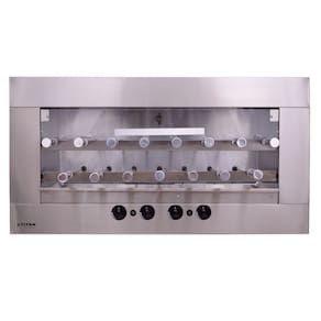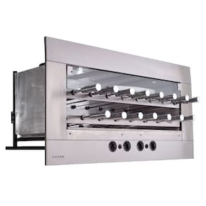 DESIGN E ESTRUTURA: - Painel frontal MODULAR em aço inox AISI 304 escovado; - Porta frontal de vidro temperado com sistema telescópico; - Grade interna de apoio; - Válvula de segurança contra vazamento de gás; - Bandeja coletora de gordura com frente de inox; - Controlador de queimador individual; - 15 Espetos rotativos com cabo TÉRMICO – Sendo 13 simples e 02 triplos; - Lâmpada interna; - Acendedor automático de fogo.
