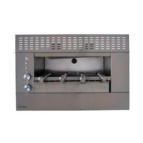 Churrasqueira a gás de embutir com 4 espetos em nicho de alvenaria. Seu espaço gourmet mais moderno e prático. Silenciosa e não produz fumaça, o que faz o seu churrasco muito mais agradável.