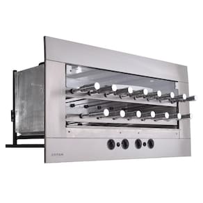 Este modelo é equipado com quatro queimadores infravermelho, um painel frontal modular em aço inox AISI 304 escovado, e uma bandeja coletora de gordura com frente de inox. O controlador de queimador individual e a porta frontal de vidro temperado com sistema telescópico oferecem praticidade e segurança. Com quinze espetos rotativos (treze simples e dois triplos) com cabos térmicos, uma lâmpada interna e um acendedor automático de fogo, cada espeto suporta até 1,7 kg de carne.