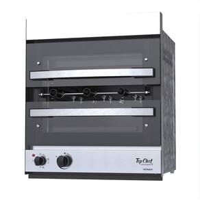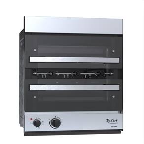 A churrasqueira a gás de embutir Top Chef possui 3 espetos giratórios com capacidade de 2 kg de carne cada, queimador infravermelho, acendimento super automático, luz interna, bandeja coletora de resíduos esmaltada Easy Clean, porta de vidro bi partida com puxadores em alumínio, corpo interno esmaltado Easy Clean e acabamento externo em aço inox escovado.