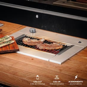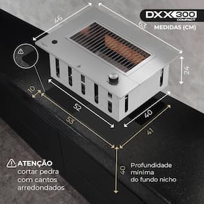 Churrasqueira a gás compact dxx300 - gás natural - grelha argentina - acabamento em teflon - sem tampa Churrasqueira a gás de embutir dxx 300: muito mais churrasco mesmo com pouco espaço procurando uma churrasqueira a gás que dê o mínimo de trabalho e proporcione o máximo de conforto Conheça a poderosa dxx 300. A dinoxx pensou em tudo para facilitar sua experiência na hora de churrasquear. Desde a instalação até o uso: absolutamente tudo foi pensado para transformar o churrasco em casa em algo mais prático e prazeroso com a dxx 300. Portanto, se você tem pouco espaço, mas não abre mão do churrasco em casa, esta é a churrasqueira a gás de embutir ideal. E para completar, a dxx 300 passa a fazer parte da decoração com design minimalista em aço inox e acabamento impecável. Conheça a famosa boquinha do dragão: A churrasqueira a gás de embutir dxx 300 é o nosso modelo compacto especialmente recomendado para atender apaixonados por churrasco que possuem pouco espaço físico para instalar a sua churrasqueira. E mesmo sendo compacta, possui 02 queimadores em uma área menor de cocção, proporcionando uma potência calorífica superior aos outros modelos residenciais. Dessa forma, atende perfeitamente até 15 pessoas no conforto do seu lar. de muito churrasco Benefícios da churrasqueira Churrasqueira a gás de embutir: linha compacta e muito poderosa; assa um delicioso churrasco com pouquíssimo trabalho e produz o mínimo de fumaça, dispensando até a coifa, na grande maioria dos ambientes; fabricada 100% em aço inox; acessórios e grelhas removíveis; design minimalista; praticidade na limpeza; válvula de segurança corta gás safe stop . Especificações técnicas 100% em aço inox 304: grelhas, tampo, bandeja coletora de gordura; suportes para espetos; aço inox 430: cocho; 02 queimadores a gás infravermelho geração de energia por queimador 2250 kcal/h ; 01 botão com regulagem de temperatura do queimador; pressão de trabalho do queimador: glp botijão 2,8 kpa - glp encanado 2,5 kpa - gn encanado 1,25 kpa; bicos injetores com de 0,92mm gás glp e 1,4mm gás gn; sistema safe stop válvula de segurança corta gás ; acendimento automático pilha . Marca: Não Informado