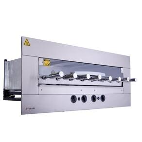 Este modelo possui quatro queimadores infravermelho, um painel frontal modular em aço inox AISI 304 escovado, e uma bandeja coletora de gordura com frente de inox. O controlador de queimador individual e a porta frontal de vidro temperado com sistema telescópico oferecem praticidade e segurança. Com oito espetos rotativos (seis simples e dois triplos) com cabos térmicos, uma lâmpada interna e um acendedor automático de fogo, cada espeto suporta até 1,7 kg de carne.