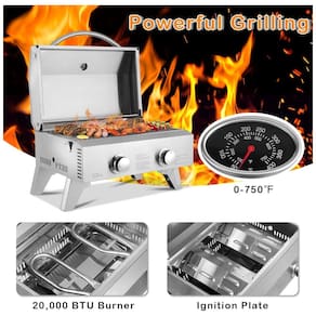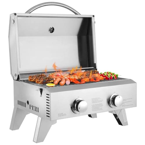 Easy Clean o grelhador é fabricado em aço inoxidável, incluindo a grelha para grelhar. Isso torna a limpeza consideravelmente mais fácil. Bandeja de gordura removível segura pingos de comida. Ignição Elétrica Fácil de acender, basta segurar o botão ao girar, ouvir um clique e o acendedor acende um jato de gás que acende o queimador. Cada queimador tem um botão de controle separado, para que você possa usar um ou dois de cada vez. Dois Queimadores a opção de usar apenas um queimador, como normalmente grelhar para dois, é uma vantagem quando você faz churrasco ao ar livre. O queimador em forma de U fornece um calor máximo de 10.000 BTU e Marca: Não Informado