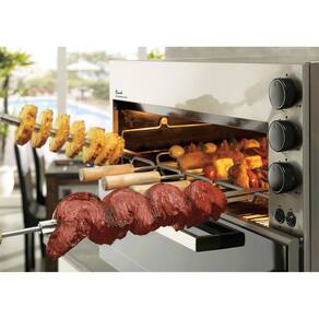 Caracteristicas: Modelo: 18123-19258 espetos GN Tensao: Bivolt Potencia do Motor: 5 x 4W Potencia dos Queimadores: 3 x 2.250Kcal Consumo de Gas: 570 g/h de GLP Pressao do Gas: 28 a 37 mbar = 2,8 a 3,7 kPa -GLP- / 20 mbar = 2,0 kPa -GN-