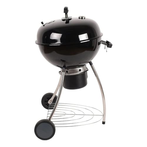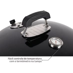 Churrasqueira a bafo móvel, com acendimento rápido, controle de temperatura por termômetro embutido na tampa, grelha em aço, alças externas em metal e duas rodas para fácil locomoção. Ideal para uso externo.Vendido por Home Living e entregue por PontoFrio