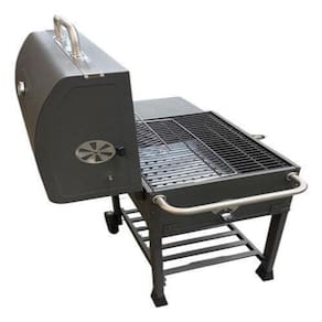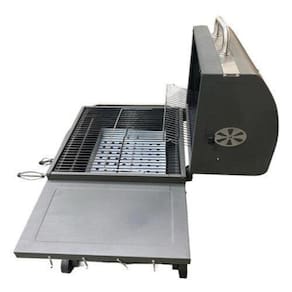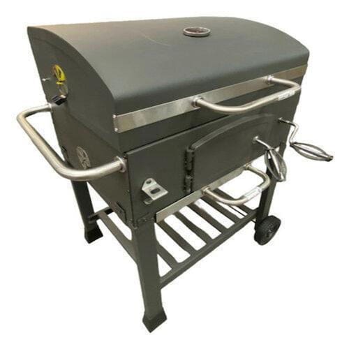 Feito com chapas de aço e com termometro de luxo. Area para cozimento: 58 x 42 cm l x p . Tampa articulada para cozinhar ou defumar Grelha com acabamento esmaltado para facilitar a limpeza Prateleira lateral dobrável com gancho e armazenamento Bandeja de carvão de altura ajustável para controle de temperatura Porta de acesso para carvão e coletor de cinza removível Grelha de aquecimento separada. A grade se encaixa perfeitamente em todos os jardins. Graças à construção sólida, é muito estável e garante a segurança de uso. Seu tamanho permite que você prepare muitas deliciosas iguarias ao mesmo tempo.