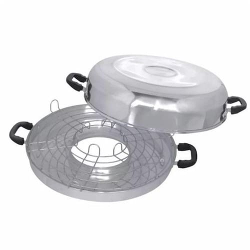 Descrição: A Churrasqueira Grill pode ser usada sobre a boca do seu fogão a gás com total segurança. O fato de possuir tampa evitará que possíveis gotículas da gordura da carne sujem sua cozinha. A grade é fabricada em aço estanhado, único tratamento permitido neste tipo de produto pelo fato de não trazer riscos de contaminação aos alimentos, isso também promove uma maior durabilidade ao produto, característica necessária pelo fato dela estar em contato direto com o sal, que é altamente corrosivo. Churrasqueira para fogão você usa de acordo com sua criatividade, você pode grelhar carnes, frango, linguiça, peixe e legumes. E Não são apenas carnes que podem ser preparadas, se você precisar aquecer alimentos pré-cozidos, como uma pizza, basta usar uma forma de pizza sobre a grelha desta churrasqueira. Veja como é fácil utilizar a Churrasqueira Grill: 1. Coloque sua churrasqueira antiaderente sobre a boca do fogão, 2. Retire a tampa e a grelha, 3. Coloque água no fundo da churrasqueira para que no momento que estiver grelhando o alimento, a gordura caia diretamente na água e recoloque a grelha, 4. Agora basta colocar a carne sobre a grelha, acender o fogo e fechar a tampa. Especificação: 30cm diâmetro x 10cm altura Características: Composição: Alumínio Polido Medida Individual: Diâmetro (cm): 30 Comprimento com alça (cm): 40 Diâmetro (fundo para encaixe da boca): 11 cm Material: Alumínio Polido e Grelha em Aço Cromado ITENS INCLUSOS Churrasqueira com alças laterais Tampa com alças laterais Grelha