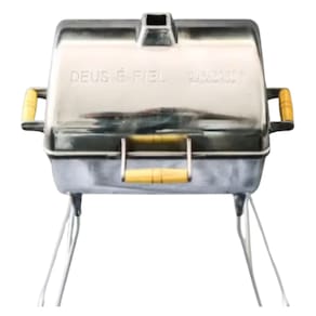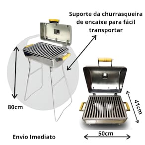 Medidas : Comprimento 50 cm x 41 cm larguraGrelha: comprimento 38 cm / largura 30 cm / Possui Grelha dupla face um lado lisa e outro Parrilha. Suporte ( pés ) 59,50 cm Profundidade para Carvão 31 cm
