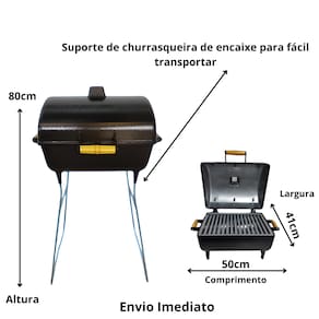 Medidas : Comprimento 50 cm x 41 cm larguraGrelha: comprimento 38 cm / largura 30 cm / Possui Grelha dupla face um lado lisa e outro Parrilha. Suporte ( pés ) 59,50 cm Profundidade para Carvão 31 cm