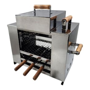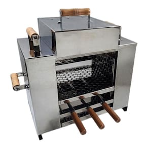 Churrasqueira ecológica sem fumaça, modelo grande, 3 andares, 2 grelhas + 3 espetos, tampa a bafo, zero fumaça, ideal para ambientes internos ou varandas. Caixas de carvão nas laterais com bandeja coletora de gordura na parte inferior para evitar fumaça. Requer carvão 100% eucalipto de boa qualidade e álcool sólido ou em gel para acendimento sem fumaça.Vendido e entregue por Olist Store