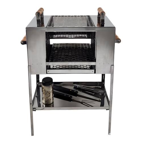 Churrasqueira a carvão para apartamento em aço inox 430. Ideal para ser Utilizado em locais fechados como varandas, sacadas e áreas de serviço, pois não produz fumaça. Aviso: tempero, faca e pegador meramente ilustrativos não acompanham o produto . Os pés são de aço inox e desmontáveis. Possui espaço para colocar 3 espetos ao retirar a grelha inferior É possível embutir quando retirados os cabos e pés. Aço inox 430 Medidas: Largura: 45 cm Largura com os cabos 55cm Comprimento: 27 cm Altura sem os pés: 27 cm Altura com os pés: 73 cm Grelha Largura: 24 cm Comprimento: 27 cm Acompanha 2 grelhas 2 caixas para armazenar o carvão 2 tampas da caixa de carvão 1 bandeja para armazenar a gordura Pés da churrasqueira Bandeja embaixo para guardar objetos também está inclusa Por que churrasqueira sem fumaça O que provoca a fumaça no churrasco é o contato da gordura da carne no carvão. Nesta churrasqueira as caixas de carvão são nas laterais. Desta forma a gordura da carne cai diretamente na bandeja de água que fica na parte debaixo, não produzindo fumaça. Mas é preciso tomar cuidado para não sair fumaça no acendimento. É necessário usar carvão 100% eucalipto de boa qualidade e álcool sólido ou em gel. Se for outro tipo de carvão e acendedor, sairá fumaça sim. Marca: Não Informado