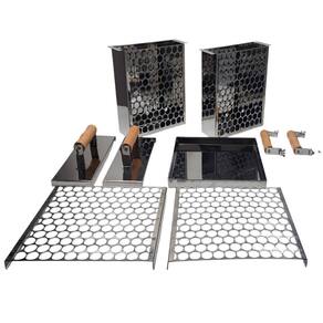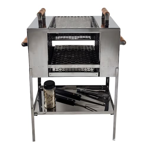 Churrasqueira a carvão para apartamento em aço inox 430. Ideal para ser Utilizado em locais fechados como varandas, sacadas e áreas de serviço, pois não produz fumaça. Aviso: tempero, faca e pegador meramente ilustrativos não acompanham o produto . Os pés são de aço inox e desmontáveis. Possui espaço para colocar 3 espetos ao retirar a grelha inferior É possível embutir quando retirados os cabos e pés. Aço inox 430 Medidas: Largura: 45 cm Largura com os cabos 55cm Comprimento: 27 cm Altura sem os pés: 27 cm Altura com os pés: 73 cm Grelha Largura: 24 cm Comprimento: 27 cm Acompanha 2 grelhas 2 caixas para armazenar o carvão 2 tampas da caixa de carvão 1 bandeja para armazenar a gordura Pés da churrasqueira Bandeja embaixo para guardar objetos também está inclusa Por que churrasqueira sem fumaça O que provoca a fumaça no churrasco é o contato da gordura da carne no carvão. Nesta churrasqueira as caixas de carvão são nas laterais. Desta forma a gordura da carne cai diretamente na bandeja de água que fica na parte debaixo, não produzindo fumaça. Mas é preciso tomar cuidado para não sair fumaça no acendimento. É necessário usar carvão 100% eucalipto de boa qualidade e álcool sólido ou em gel. Se for outro tipo de carvão e acendedor, sairá fumaça sim.