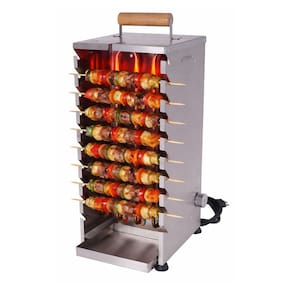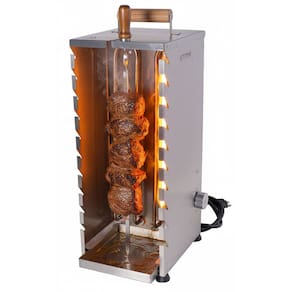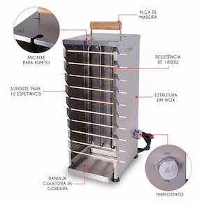 Churrasqueira elétrica portátil com estrutura externa e interna em Inox, alça em madeira resistente ao calor, resistência de 1800W, termostato Mín/Méd/Máx, luz piloto, pés antiderrapante e bandeja coletora de gordura em Inox. Capacidade para 10 espetinhos ou 1 espeto na vertical.Vendido por Dolar Churrasqueiras e entregue por PontoFrio