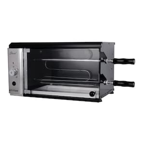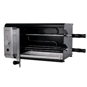 Churrasqueira elétrica vertical com 2 espetos rotativos, sem fumaça, ideal para ambientes internos, com queimador infravermelho, painel em inox, estrutura em aço carbono com pintura epóxi, porta em vidro temperado e bandeja coletora de gordura.Vendido por Dolar Churrasqueiras e entregue por PontoFrio