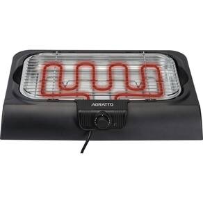 Churrasqueira elétrica portátil com termostato ajustável, bandeja coletora de gordura e grelha removível com ajuste de altura. Produz menos fumaça que churrasqueiras a carvão.