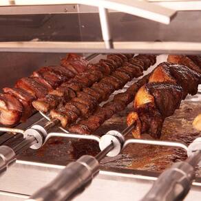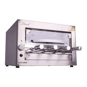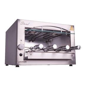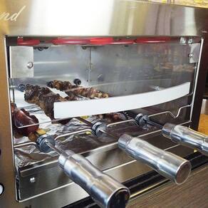 Churrasqueira elétrica de bancada com 4 espetos rotativos (3 simples e 1 triplo), porta de vidro temperado com sistema telescópico, bandeja coletora de gordura, grade interna de apoio e capacidade para até 6,8 kg de carne. Estrutura externa em aço inox AISI 304 escovado. Inclui luz piloto, indicadores de temperatura e espetos com cabo térmico em inox. Potência total das resistências: 3000W. Motorredutor elétrico de 12V com 28W de potência. Giro do espeto: 6RPM. Tensão: 127V. Frequência: 60Hz.