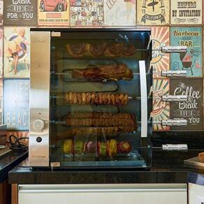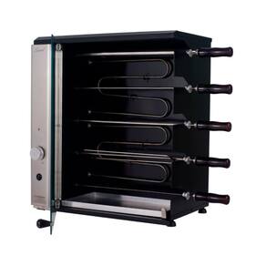 Churrasqueira elétrica de bancada vertical com 5 espetos rotativos (4 simples e 1 triplo), painel curvo em inox, porta de vidro temperado e bandeja coletora de gordura. Potência total de 2100W (resistências) e motorredutor de 28W. Possui luz piloto e seletor de temperatura com níveis indicativos. Estrutura externa em aço carbono com pintura epóxi em preto fosco. Espetos com cabos de madeira preta. Capacidade de até 8,5 kg de carne (1,7kg por espeto).Infelizmente não temos estoque do produto que você está procurando no momento.