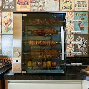 Churrasqueira elétrica de bancada vertical com 5 espetos rotativos (4 simples e 1 triplo), painel curvo em inox, porta de vidro temperado e bandeja coletora de gordura. Potência de 3000W. Ideal para ambientes internos, sem fumaça.Infelizmente não temos estoque do produto que você está procurando no momento.