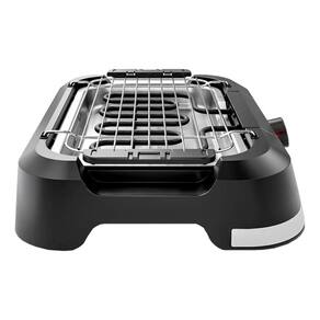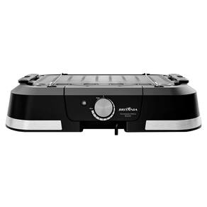 Churrasqueira elétrica com 1500W de potência, controle de temperatura ajustável até 250°C, grelha removível com alça e duas opções de altura, bandeja coletora de gordura para redução de fumaça, alças laterais com toque frio e pés antiderrapantes. Ideal para uso interno.