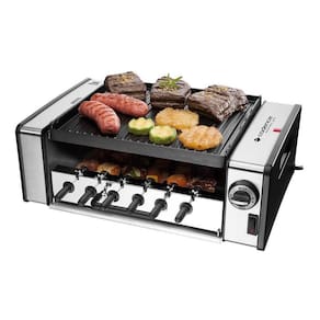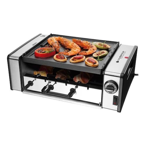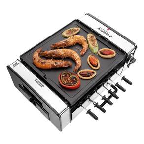 Churrasqueira elétrica com 3 níveis de temperatura, chapa reversível em ferro fundido com revestimento antiaderente, 6 espetinhos giratórios automáticos e coletor de gordura removível.