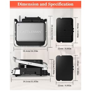 A grelha interna 5 em 1 Grill CATTLEMAN CUISINE pode ser usada como grelha de contato, prensa de panini , fabricante de sanduíche, grelha completa, grelha completa ou meia grelha, meia chapa para diferentes necessidades de cozimento em uma máquina. A estrutura da dobradiça de amortecimento duplo permite rotação da tampa 180 , melhor para diferentes espessuras dos alimentos. Sem engrenagens adicionais para ajustar a altura, ela pode ser parada em qualquer ângulo dentro de 180 com operação com uma mão.