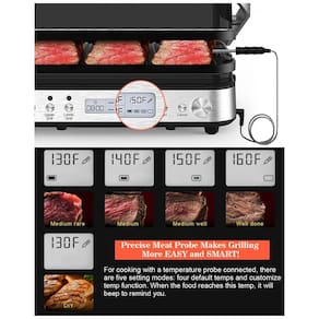 Sonda inteligente Não há necessidade de cortar a verificação de alimentos por dentro ou investigá los constantemente usando um termômetro de leitura instantânea. Nossa grade elétrica vem com uma sonda inteligente e pode definir a função da sonda de forma independente, existem 5 modos de configuração. Quando o alimento atingir a temperatura definida, ele emitirá um bipe para lembrá lo. Habilite o controle inteligente de temperatura e cozimento.