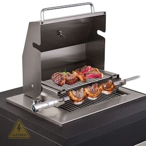 Grill embutido estilo Cooktop com tampa, fabricado em aço inox 304, ideal para grelhar e assar carnes, peixes e legumes. Conta com 2 resistências de 3000W, temperatura ajustável de 50°C a 300°C e painel com luz piloto e indicadores de funcionamento. Acompanha tampa exclusiva com termômetro, espeto simples com cabo térmico e grelha de descanso. Possui grelha removível em inox 6,35mm e bandeja para água. Disponível em 127V ou 220V, suporta até 5 kg de carne e tem giro manual do espeto. Produto nacional, resistente e eficiente.