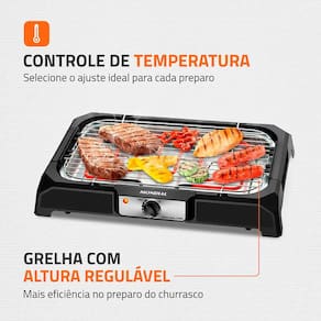 Potência: 2000W de potência e controle de temperatura. Precisão e eficiência na hora do preparo, e sem nenhuma fumaça; Versatilidade: Grelha carnes, frangos, peixes, legumes, vegetais, espetinhos, hambúrgueres com rapidez; Economia: até 80 mais econômica que churrasqueira a carvão: (Economia comprovada quando comparado o custo do consumo elétrico da churrasqueira durante o período de 1 hora, com o custo de 2,5kg de carvão vegetal.); Perfeita para quem adora um churrasco: Por ser uma churrasqueira de mesa é ótima para apartamentos, sacadas pequenas, e ambientes fechados, - não faz fumaça; Portátil: praticidade para montar, usar, limpar, guardar e transportar: Pesa 1,74kg , tem alças laterais e pedestal desmontável para facilitar o transporte e montagem. Não gruda gordura, e a bandeja coletora removível deixa prática a limpeza; 1 ano de garantia, e mais informações das peças e partes do produto: A churrasqueira tem grelha de aço cromado com altura regulável, bandeja coletora de gordura e cabo com plugue de 20A (amperes). Tamanho da grelha 40x 24cm. Uso residencial.