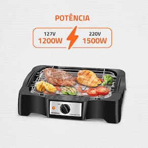 DADOS TÉCNICOS: - Voltagem: 127V - Potência: 1200W - Material: PP e Metal - Benefícios: Não solta fumaça, é prática, leve e portátil - Tipo de preparo: Carnes de churrasco, grelhados, legumes, pão de alho e outros alimentos - Luz indicadora: Sim - Tipo de tomada: 20A - Antiaderente: Não - Controle de temperatura: Sim - Comprimento do cabo: 1,50m - Medidas (AxLxP): 27,5x40,5x9 cm - Peso: 1,300 kg - Garantia: 12 meses