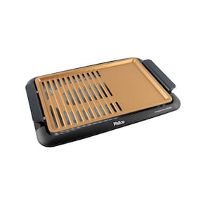 Dimensões AxLxP (mm): 80x355x540. Material: Metal e Plástico. Níveis de Temperatura: 5. Chapa Antiaderente: Sim. Alças Laterais: Sim, com toque a frio (Baquelite). Bandeja Coletora para Resíduos: Sim. Base Antiderrapante: Sim. LED Indicador de Funcionamento: Sim. 60% grelha e 40% chapa lisa.Vendido e entregue por Lumienergy