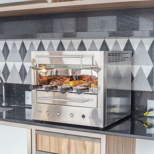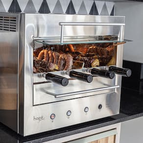 A Churrasqueira Assador Elétrica Rotativa Bake Smart 04 de Bancada é a solução ideal para sua cozinha, espaço gourmet, cantinho do churrasco ou aonde você preferir. Ela possui uma estrutura em aço inox 304 para maior durabilidade e facilidade na limpeza. Sua resistência possibilita maior potencia e rapidez para assar seu churrasco. O sistema de rotação de espetos, permite assar de forma homogênea todos os tipos de carne, deixando seus alimentos muito mais saborosos. Possui bandeja coletora de gordura, facilitando a limpeza e deixando seu alimento muito mais saudável. Além disso, possui grelha em aço com acabamento cromado para gratinar pizzas, carnes e outros alimentos. A Churrasqueira Assador Bake Smart é ecologicamente correta, não produz fumaça e assa seu churrasco sem prejudicar o meio ambiente. CARACTERÍSTICAS TÉCNICAS: - Produzida em Aço Inox 304 - Lâmpada Interna - Sistema de Rotação de Espetos - Aquecimento por Resistência Elétrica - Grelha com Acabamento Cromado - Vidro Temperado Reticulado - Desenvolvida para Bancadas - Potencia do Motor de 100w - Capacidade de 1,5Kg de carne por espeto - Tensão 220 V - Garantia de 6 Meses MEDIDAS TOTAIS: Altura: 49,5 Cm Largura: 55 Cm Profundidade: 57 Cm Peso: 23 Kg ITENS INCLUSOS: - 1 Churrasqueira Bake Smart - 1 Bandeja Coletora de Gordura - 1 Grelha Cromada - 3 Espetos Simples - 1 Espeto Triplo INFORMAÇÕES ADICIONAIS: *As entregas são feitas em horário comercial e a montagem fica por conta do comprador. **As imagens ambientadas são meramente ilustrativas podendo apresentar itens que não compõe o produto. As cores do produto podem variar de acordo com o monitor ou percepção visual. ***Limpeza e/ou manutenção devem utilizar escova com cerdas macias e pano úmido, não utilizar produtos abrasivos. Produto Certificado conforme portaria INMETRO 371 de 29 de dezembro de 2009. CASATONA REPRESENTANTE AUTORIZADO HOPE GOURMET ®