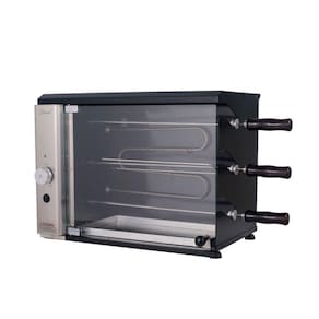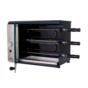 Churrasqueira elétrica vertical de bancada com 3 espetos rotativos, porta de vidro temperado, painel frontal curvo em inox, bandeja coletora de gordura, luz piloto e seletor de temperatura.Vendido e entregue por Olist