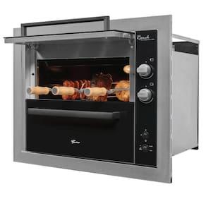 Com 3 espetos rotativos automáticos, acendimento superautomático e acabamento em aço inox escovado, oferece assados uniformes e controle eficiente de temperatura, garantindo praticidade no preparo de carnes, aves e legumes.