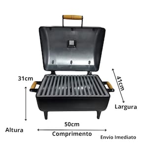 Medidas : Comprimento 50 cm x 41cm larguraGrelha: comprimento 38 cm / largura 30 cm Possui Grelha dupla face um lado lisa e outro Parrilha. Profundidade para Carvão 31 cm