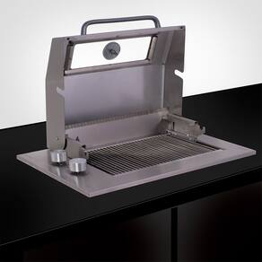 DESIGN E ESTRUTURA: - Acabamento superior em aço inox 304 - Registro de controle da temperatura com botões em alumínio - Termômetro: Registro de controle da temperatura na tampa - Tampa com visor de vidro - Bandeja para água - Grelha inteira em inox de 6,35mm - Grelha para descanso em inox - 1 Espeto simples com cabo térmico