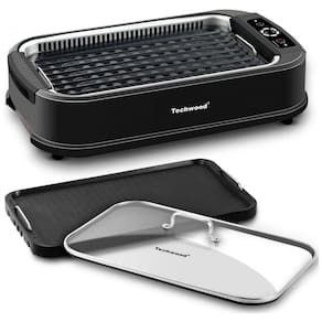 Churrasqueira elétrica com tampa de vidro temperado, placa antiaderente, controle de temperatura digital, aquecimento rápido e redução de fumaça.Vendido e entregue por Ecletiq