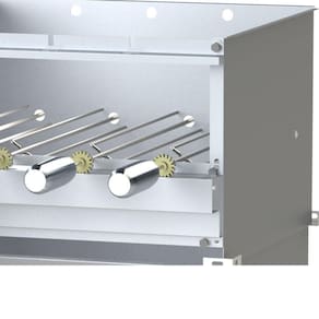 A churrasqueira a carvão com espeto giratório é ideal para quem procura um equipamento rápido e eficiente para assar carnes no espeto, mantendo sua qualidade e sabor. Sua estrutura é confeccionada inteiramente em chapa de aço inox 430, além de seus espetos, garantindo máxima resistência e durabilidade a churrasqueira profissional. Suas laterais e seu fundo são inteiramente fechados, por isso acender a churrasqueira fica muito mais fácil, já que o vento não atrapalha essa função. Possui 4 espetos giratórios de 52 cm cada que funcionam através de um motor bivolt, dessa forma é possível manter os alimentos assados e suculentos por completo. A caçamba desta churrasqueira a carvão possui rodas para facilitar sua locomoção e sapatas revestidas com PVC para não agredir a superfície em que será instalada.