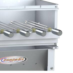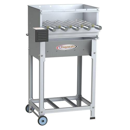 A churrasqueira a carvão com espeto giratório é ideal para quem procura um equipamento rápido e eficiente para assar carnes no espeto, mantendo sua qualidade e sabor. Sua estrutura é confeccionada inteiramente em chapa de aço inox 430, além de seus espetos, garantindo máxima resistência e durabilidade a churrasqueira profissional. Suas laterais e seu fundo são inteiramente fechados, por isso acender a churrasqueira fica muito mais fácil, já que o vento não atrapalha essa função. Possui 5 espetos giratórios de 52 cm cada que funcionam através de um motor bivolt, dessa forma é possível manter os alimentos assados e suculentos por completo. A caçamba desta churrasqueira a carvão possui rodas para facilitar sua locomoção e sapatas revestidas com PVC para não agredir a superfície em que será instalada.