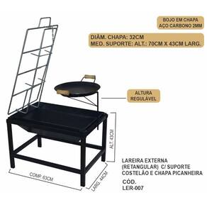 A lareira a lenha retangular em aço com suporte para costelão e picanheira é um item multifuncional projetado para uso em áreas externas, como quintais, varandas e espaços gourmet. Ela serve tanto para aquecer o ambiente em dias frios quanto para preparar alimentos de forma rústica e saborosa. Com estrutura em aço resistente, suporta altas temperaturas e oferece excelente durabilidade. O suporte para costelão permite o preparo de carnes grandes no estilo fogo de chão, como a costela bovina, garantindo um sabor defumado e tradicional. Já a picanheira possibilita o assado de cortes nobres como a picanha, tornando o equipamento perfeito para churrascos diferenciados. Seu formato retangular amplia a área de cocção e facilita o manuseio dos alimentos. Assim, essa lareira une conforto térmico, funcionalidade e uma experiência gastronômica autêntica, ideal para momentos de lazer e confraternização. Altura regulável da chapa disco.