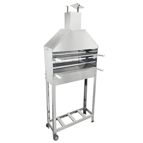 Características Técnicas: Acabamento interno e externo em Inox 430 Cavalete em Inox 430 Resistente e fácil de limpar com o inox 430 escovado Roda para facilitar a locomoção Alça em polipropileno para auxiliar a movimentação Acompanha 2 grelhas de 75cm Mobilidade fácil e conveniente com as rodas Alimentação: Carvão