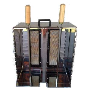 Churrasqueira Para 20 Espetinhos A Gás Em Aço Inox Tem capacidade para assar 20 espetinhos por vez ou 2 espetos de 50cm na vertical. Pode usar um ou os dois queimadores simultaneamente, sendo que o queimador mais próximo a entrada do gás sempre ficará aceso. É desenvolvida em Aço Inox 430. Não produz fumaça. O produto acompanha: - 1 x regulador de gás completo com mangueira e abraçadeiras. - 2 x Bandeja coletora de gordura; Dimensões: Altura 46 cm Largura 38 cm Profundidade 20 cm Consumo de 180g/h por queimador.A largura em cada lado para uso é de 18cm.